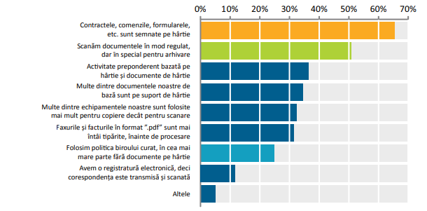 Companiile incearca in permanenta sa se perfectioneze; exista intotdeauna un nou obiectiv la orizont, un proces mai eficient sau o actualizare ce definesc drumul catre viitor. Ambitiile de azi iau forma unor procese precum transformarea digitala sau aparitia companiilor care inlocuiesc hartia cu formatul digital. Aceste obiective includ digitalizarea informatiei, simplificarea proceselor de afaceri, precum si adoptarea fluxurilor de lucru automatizate, tehnologiilor mobile si integrarea modelului cloud. Cand avem in vedere o initiativa de eliminare a documentelor de hartie sau alt plan de imbunatatire organizationala, exista conceptia eronata ca tehnologia – si nu procesele sau oamenii – este principala bariera ce impiedica eficientizarea organizatiilor. Foarte multi dintre noi credem cu tarie in tehnologie ca solutie si in capacitatea ei de a rezolva orice cerinta. Realitatea este ca nu poti obtine o reducere a utilizarii hartiilor in cadrul companiei doar cumparand un software; tehnologia este un instrument —de altfel un instrument esential – dar unul care este strans legat de suportul oamenilor si al proceselor pentru rezolvarea problemelor de afaceri si atingerea obiectivelor.