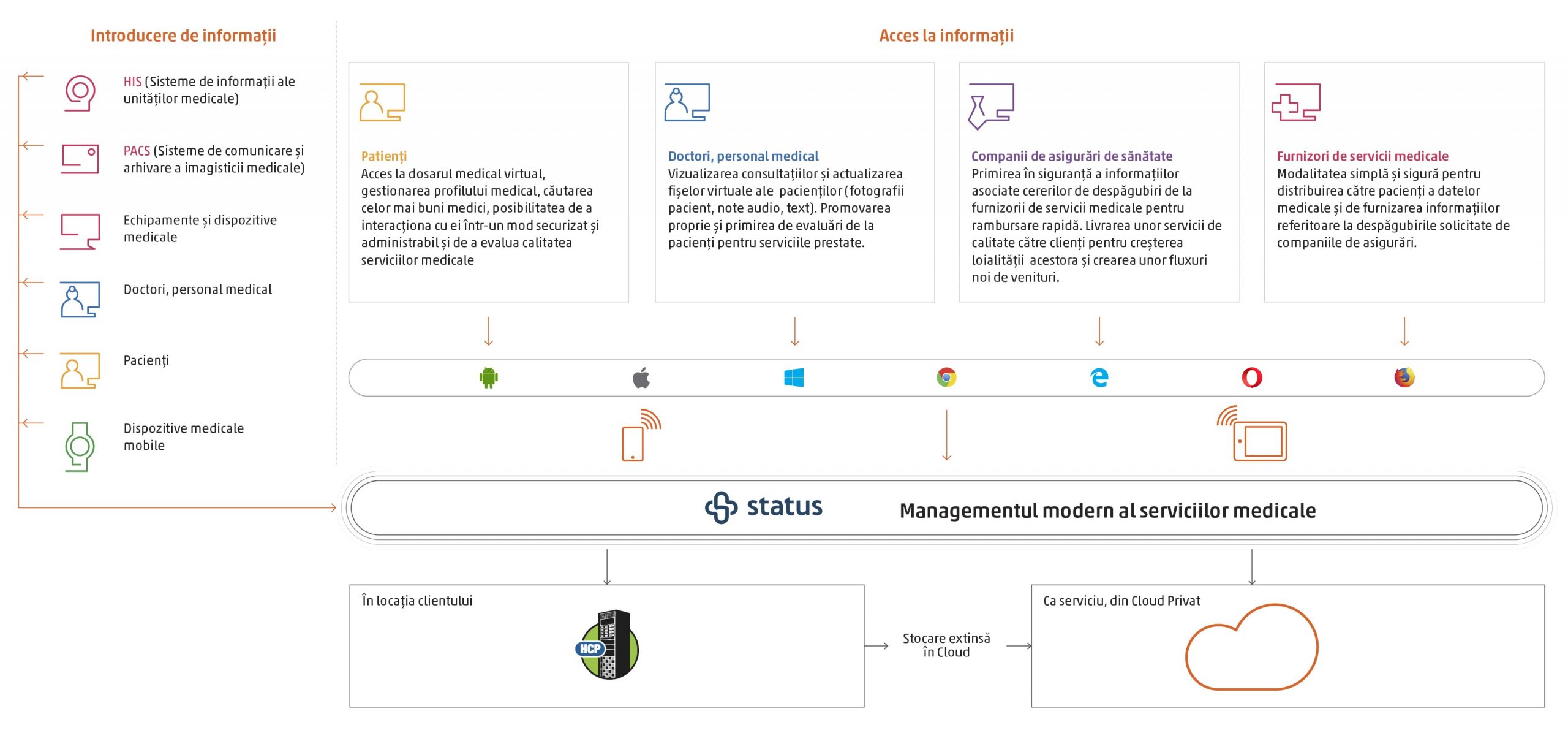 Health2Cloud este cea mai buna solutie pentru managementul relatiei medic – pacient centrata pe dosarul medical virtual al pacientului. In plus, furnizorii de servicii de sanatate si societatile de asigurare, care se straduiesc sa imbunatateasca in mod continuu serviciile lor si sa cresca baza de clienti, folosesc deja STATUS pentru mentinerea mobilitatii si accesibilitatii informatiilor medicale.